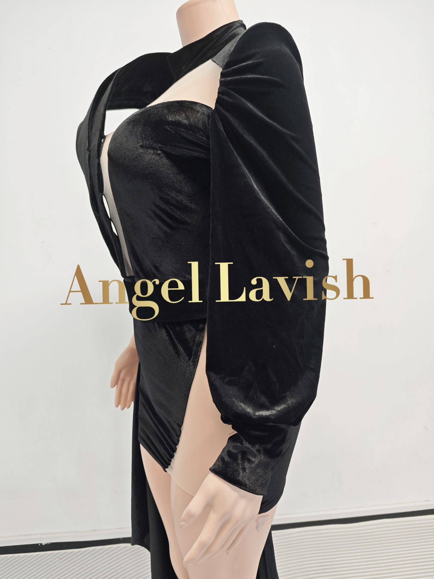 This elegant black velvet draped dress features a smooth, luxurious texture and graceful draping, perfect for ladies who love timeless evening style and formal elegance.