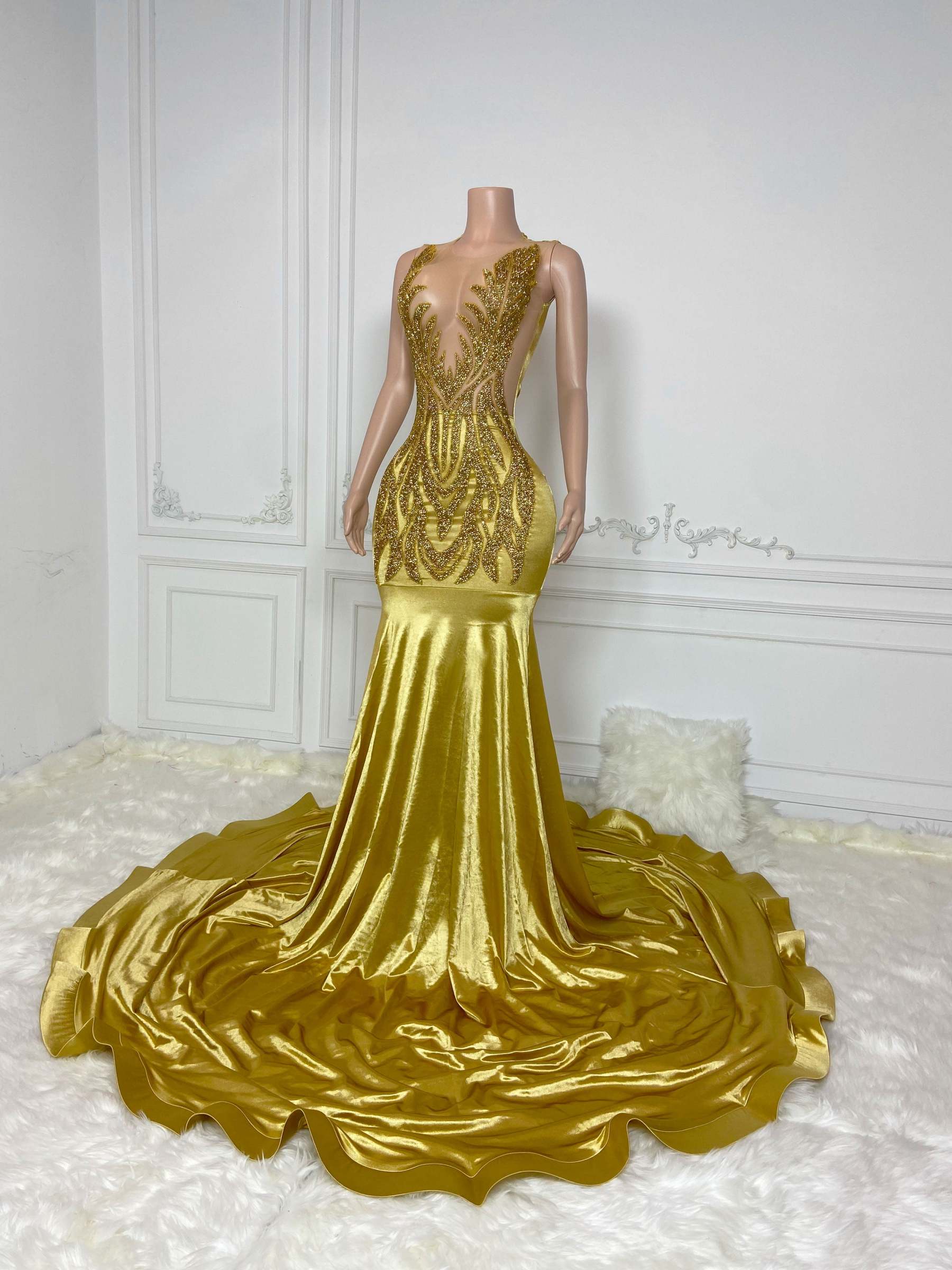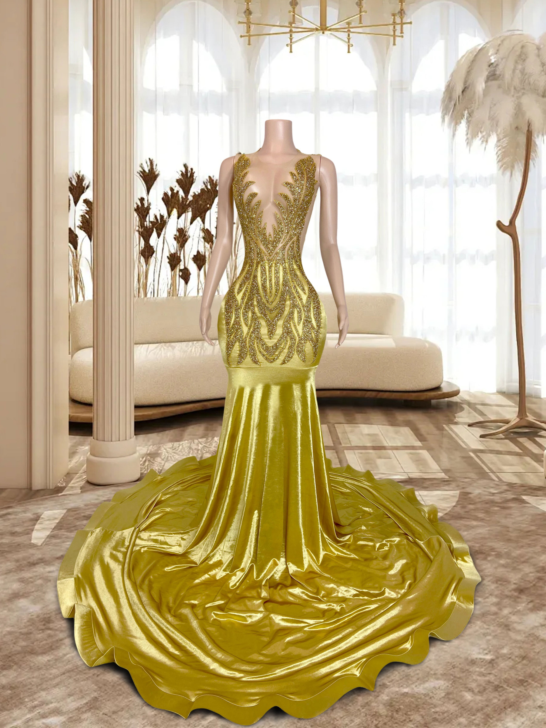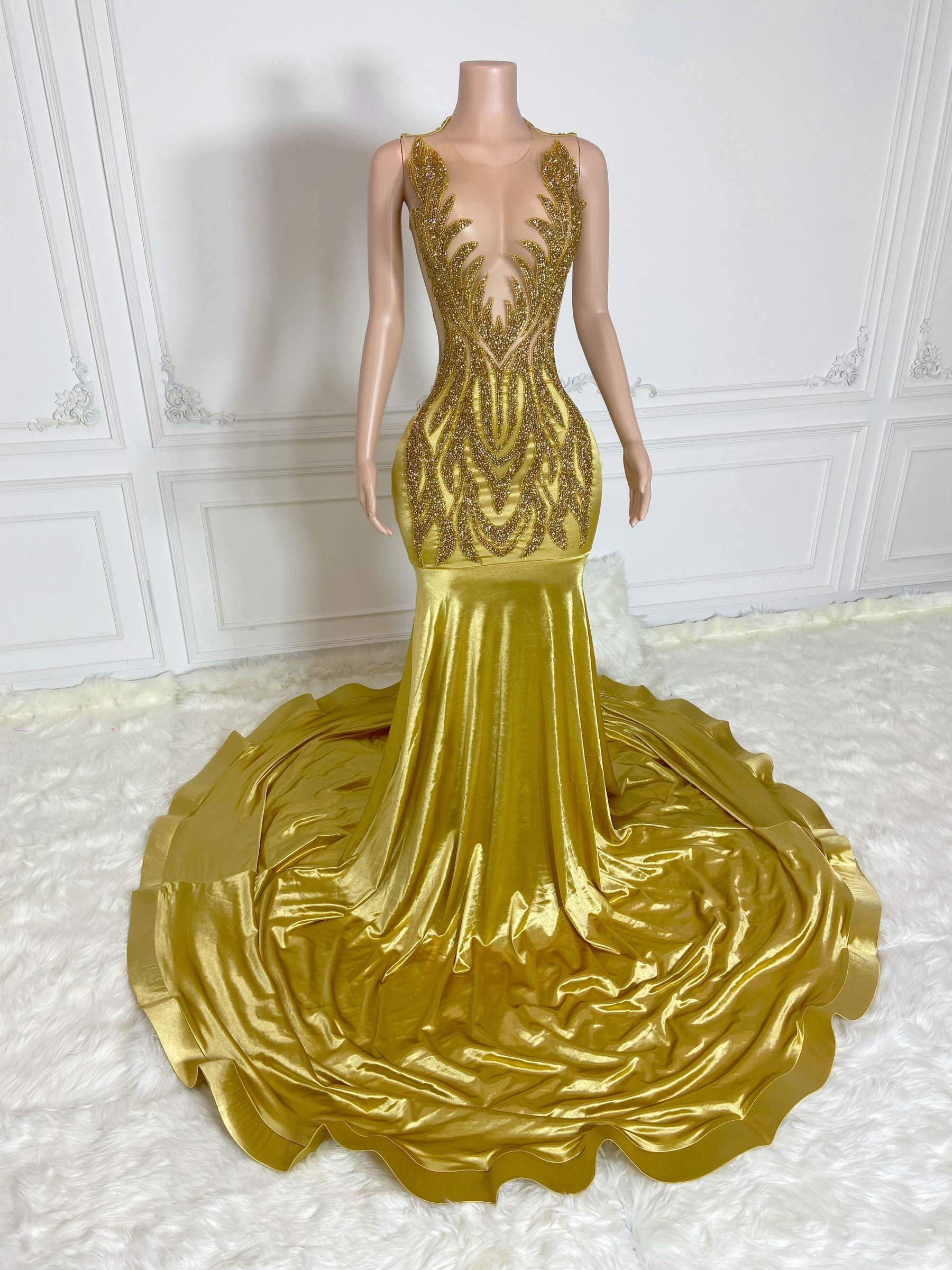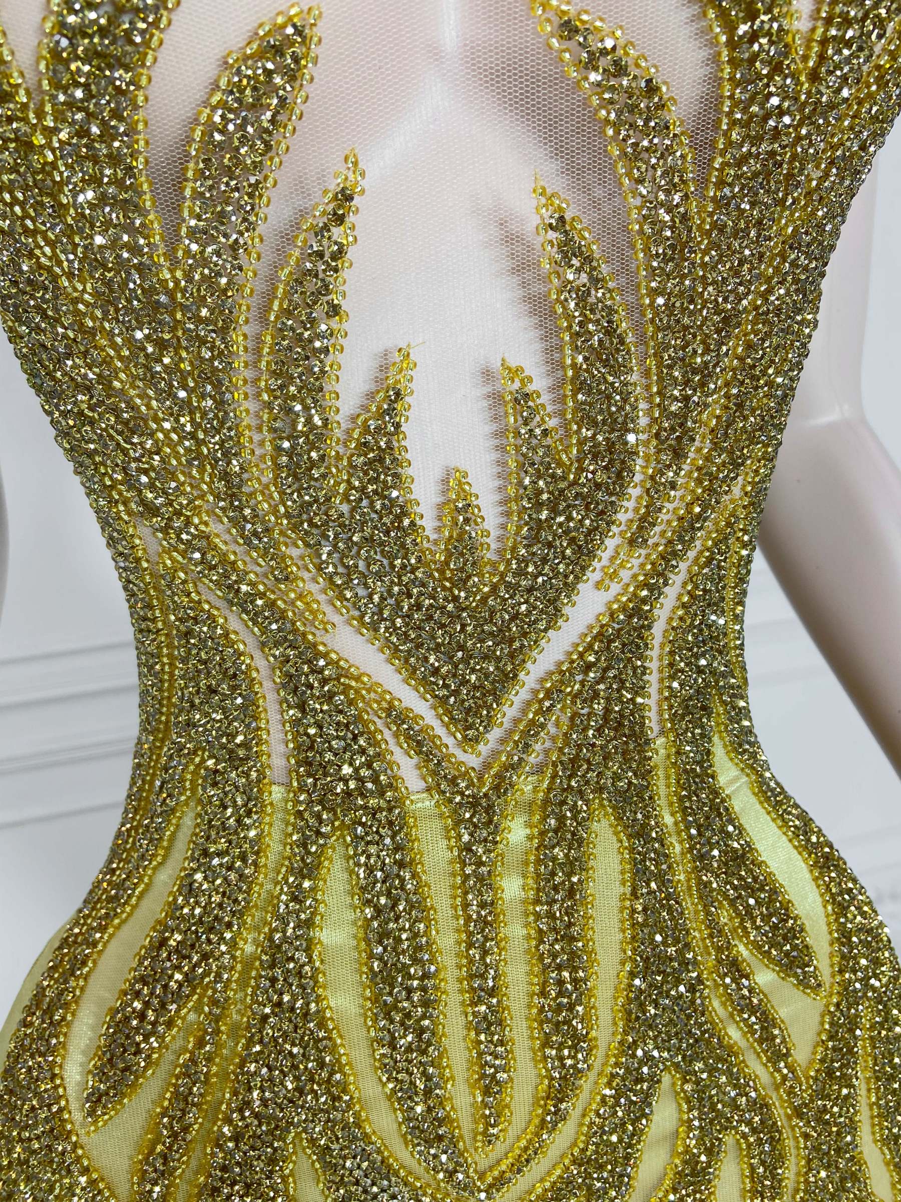 Be as glamorous as ever with this Gold Round Neck Sleeveless Gown adorned with flame rhinestones. Crafted from the finest materials, this beautiful dress will make you stand out from the crowd, and provide you with ultimate comfort. Be sure to look your best at any event with this timeless piece.