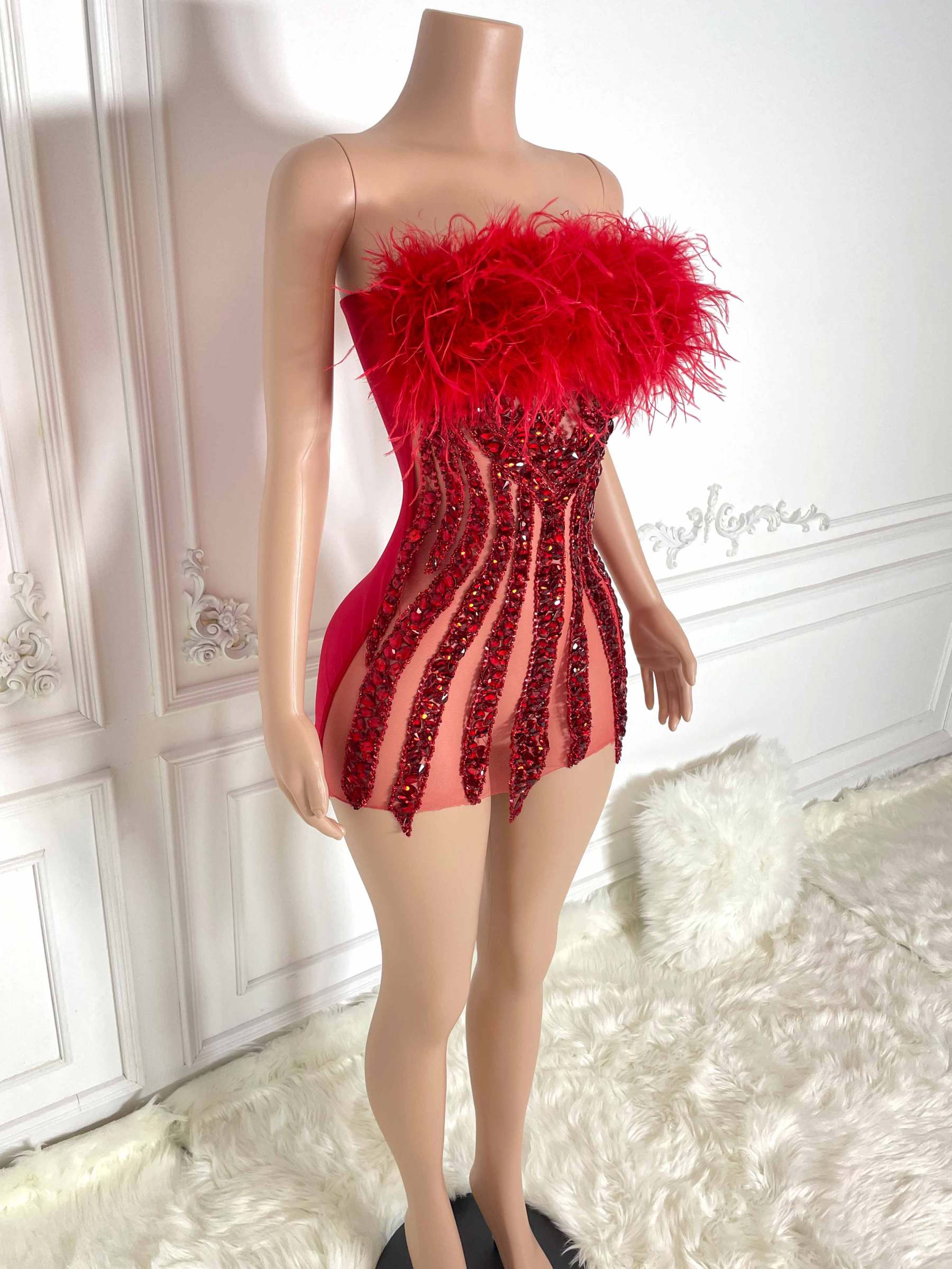 Its vibrant red hue, luxurious fur detailing, and radiant rhinestones merge to create a masterpiece that captivates the imagination. Wearing this dress is like stepping into a realm of dreams, where elegance and extravagance intertwine, leaving a trail of awe and admiration in your wake. It is a garment that celebrates the essence of femininity and embraces the power of self-expression.