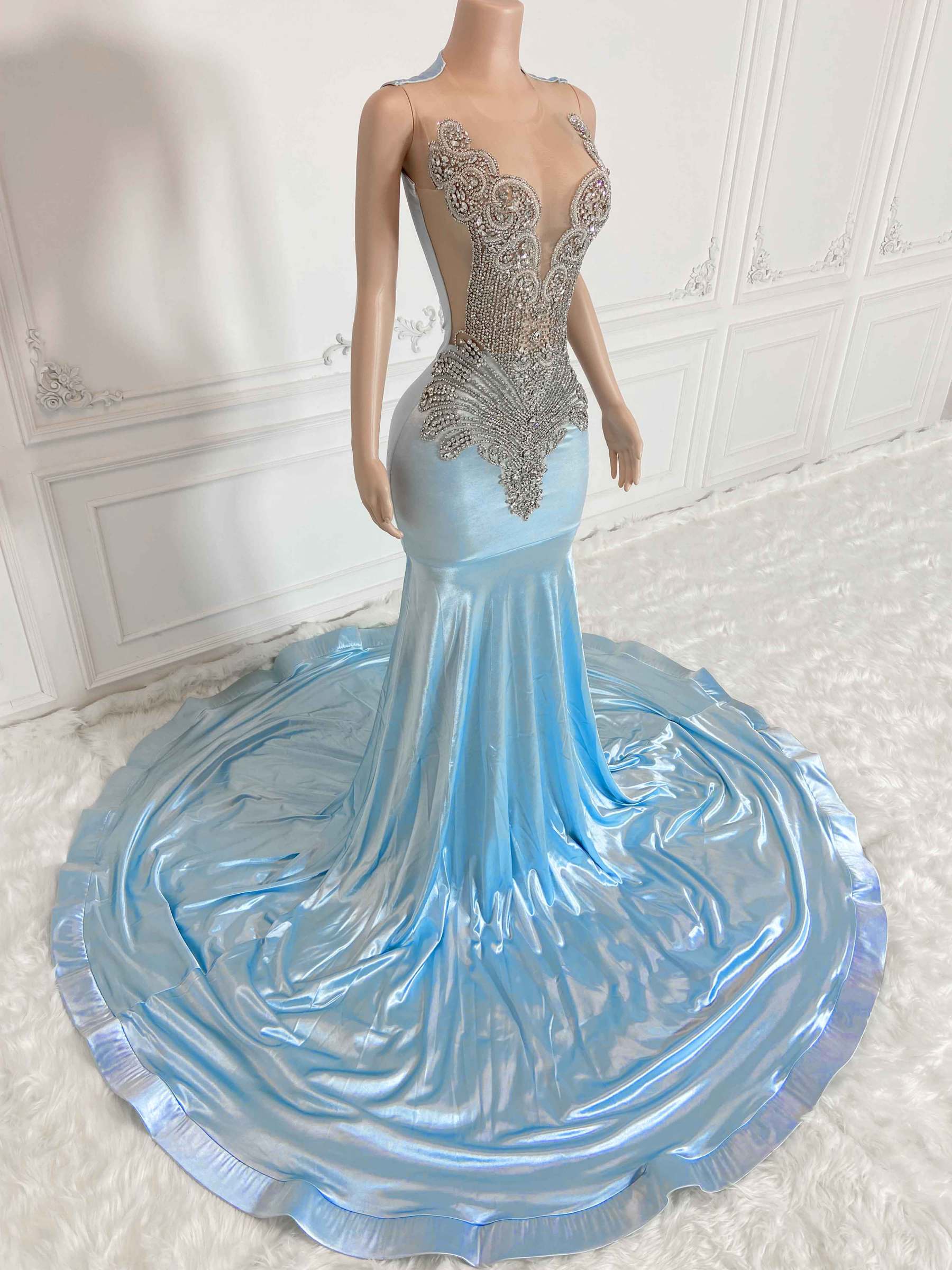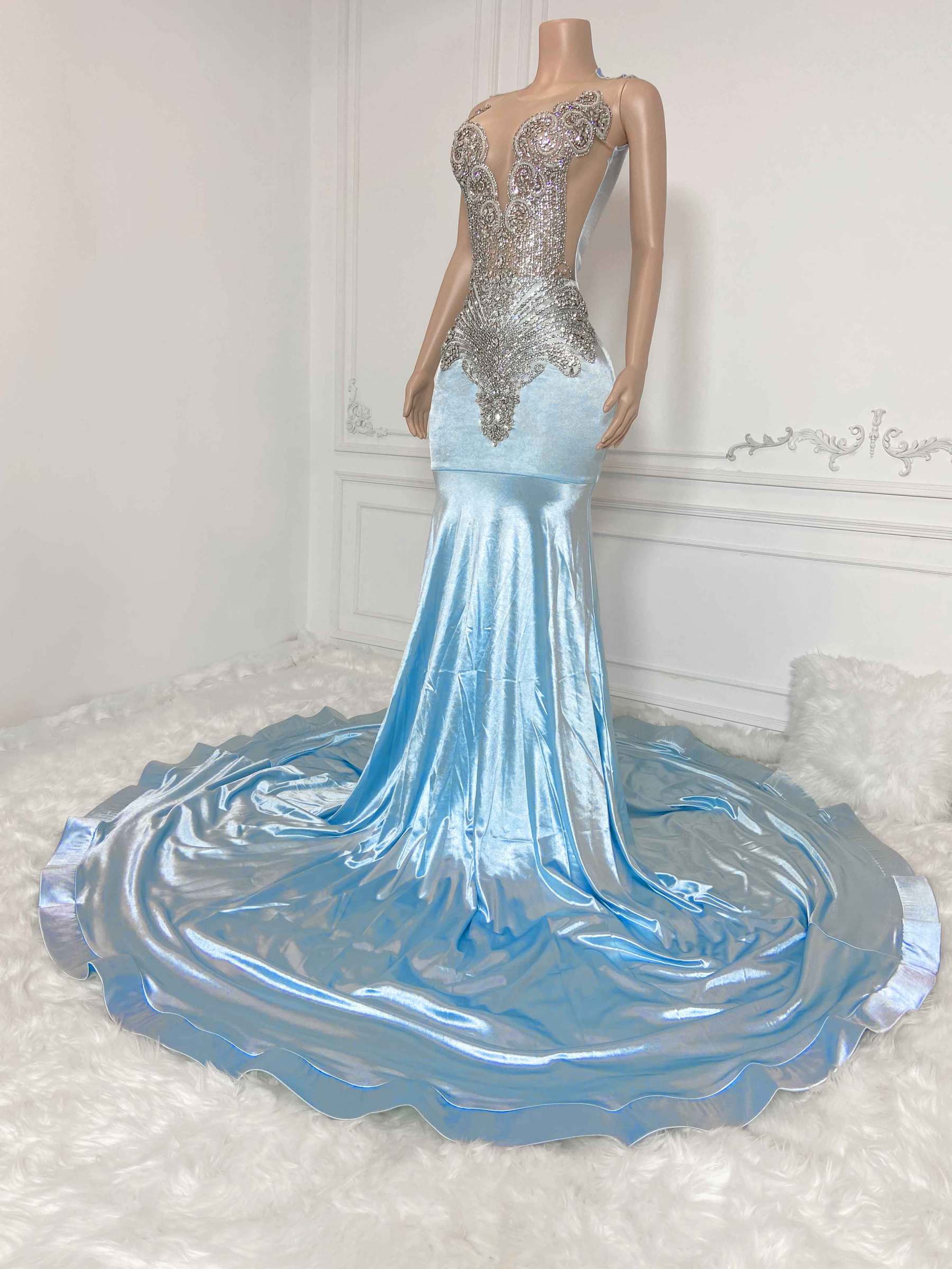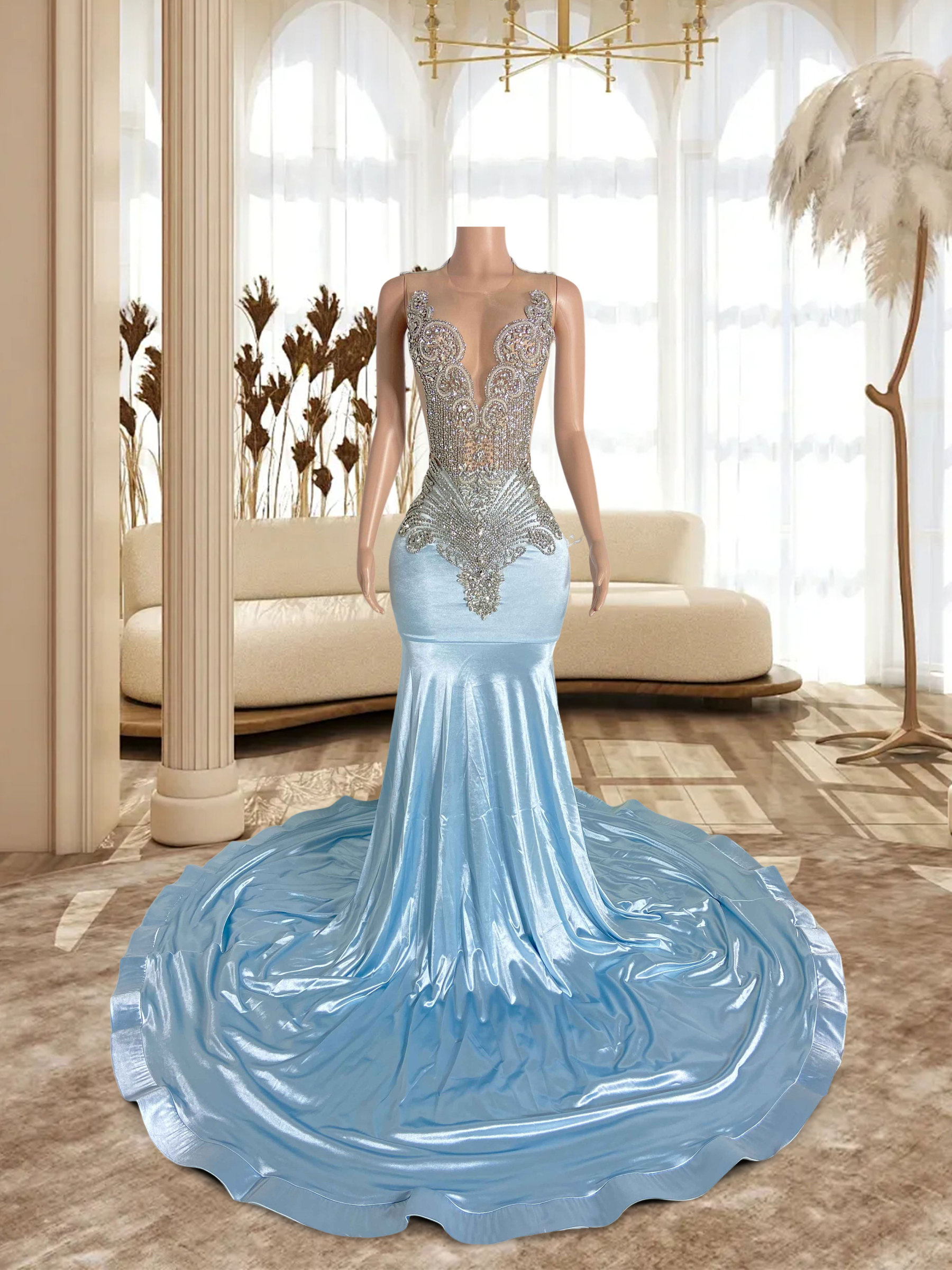 This stunning Sky Blue Hollow Out and Rhinestone Sleeveless Maxi Gown is a perfect choice for any special occasion. Crafted from a lightweight and breathable fabric, it is adorned with beautiful rhinestones all around for a luxurious and elegant look. The soft, airy fabric provides comfort and flexibility to fit any body type. Look absolutely dazzling with this beautiful gown.